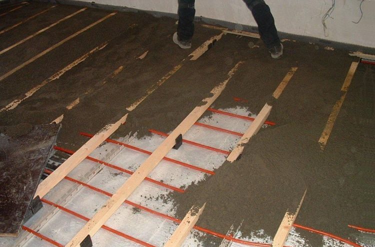 Pour la couche de support d'un sol légèrement chaud, des feuilles de plaques de polystyrène ou des bandes de panneaux de particules (ou de bois) sont utilisées. Des plaques de séparation de chaleur en métal sont posées sur la base, qui ont des rainures pour la pose de tuyaux de chauffage. La couche finale de support est constituée de plaques de fibres de gypse (GVL).