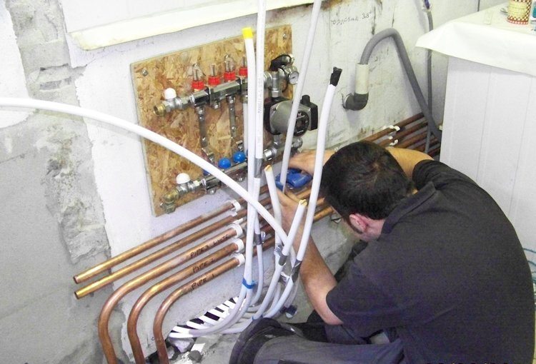 Avant de couler les chapes en béton, les tuyaux sont sertis. À ce stade, un collecteur de distribution pour le chauffage par le sol doit être installé et tous les circuits de chauffage doivent y être connectés. De plus, chacun des circuits est individuellement rempli d'eau jusqu'à ce que tout l'air soit expulsé.