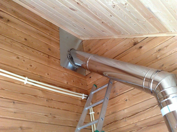 Pour empêcher la fumée de pénétrer dans la pièce, il est nécessaire d'assurer une étanchéité absolue des joints de tuyau. Pour une pose sûre des produits de tuyauterie à travers un plafond en bois, ainsi que le toit, des buses sont utilisées. Ils sont insérés dans les trous qui y sont découpés. Le tuyau est conduit vers le tuyau, après quoi il est sorti. Puisqu'il pèse beaucoup, sa fixation est effectuée par des supports muraux par incréments de 2 mètres. La sortie de la cheminée à travers le toit doit être équipée d'une rainure de toit scellée, qui empêche l'entrée d'eau de précipitation atmosphérique dans les locaux du bain. Pour se protéger contre la neige et la pluie, un champignon est généralement placé au-dessus de la sortie du système de cheminée.