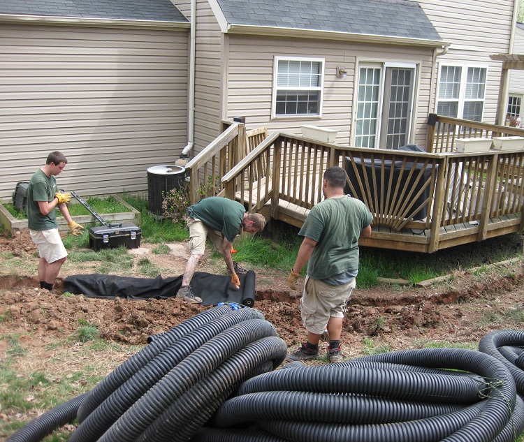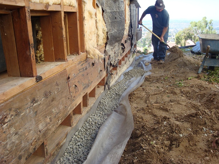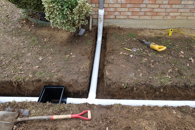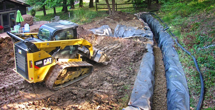 Pour le dispositif de drains, il est nécessaire de préparer des tranchées dans lesquelles une couche de géotextile est posée et de la pierre concassée