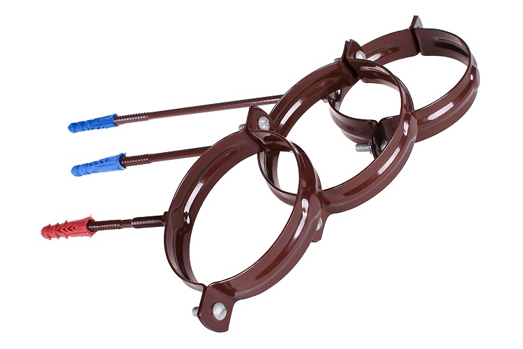 - Les supports sont montés à intervalles égaux dans un demi-mètre ou un peu plus. De même, des colliers de tuyaux verticaux sont fixés sous le drain, ce dernier fixe le genou inférieur, qui détourne un flux d'égouts pluviaux. La structure entière doit être à 10-15 cm de la façade.