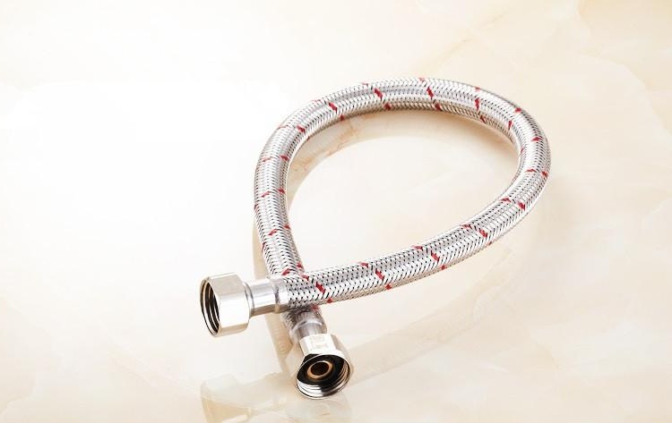 Information utile! Le but d'un tel tuyau est déterminé très simplement: le produit pour l'eau froide a un fil bleu dans sa tresse, et le modèle utilisé pour connecter l'eau chaude — rouge. Les produits combinés diffèrent en ce qu'ils ont les deux couleurs dans leur tresse.