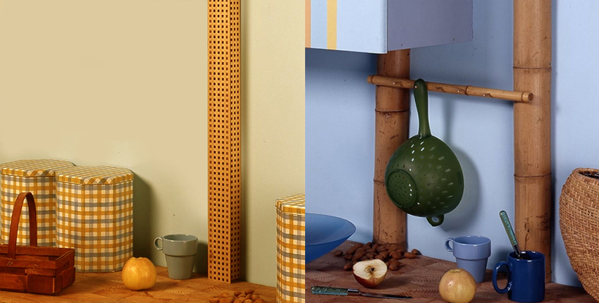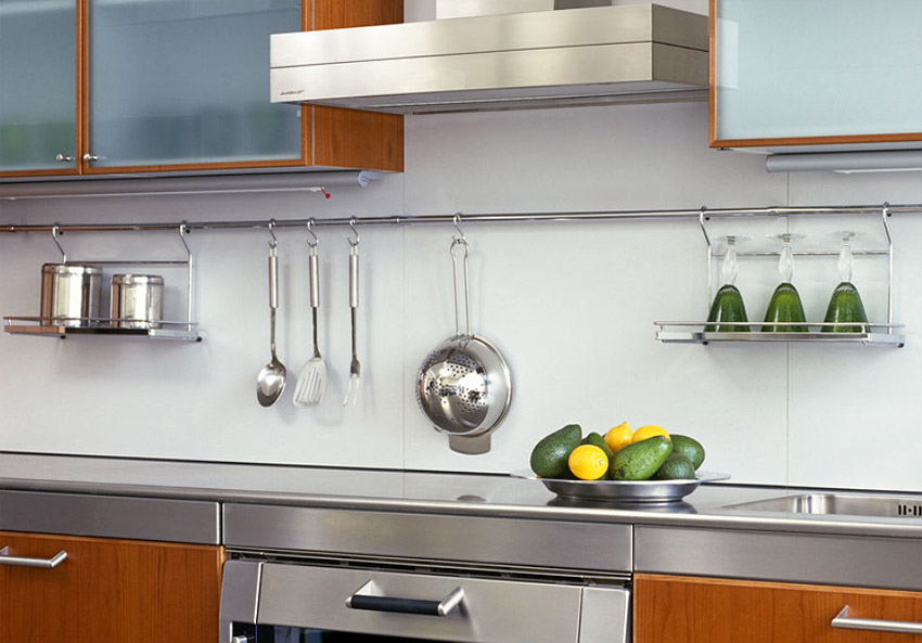 L'utilisation de cette méthode vous permet de masquer visuellement le tuyau. De l'anglais, «rail» est traduit par «barre transversale». Cette option de masquage ne prévoit pas la fermeture de la communication. Dans ce cas, le pipeline est considéré comme un élément fonctionnel de la cuisine et sert de barre transversale masquée par divers accessoires de cuisine (serviettes, poivrons, louches, etc.).