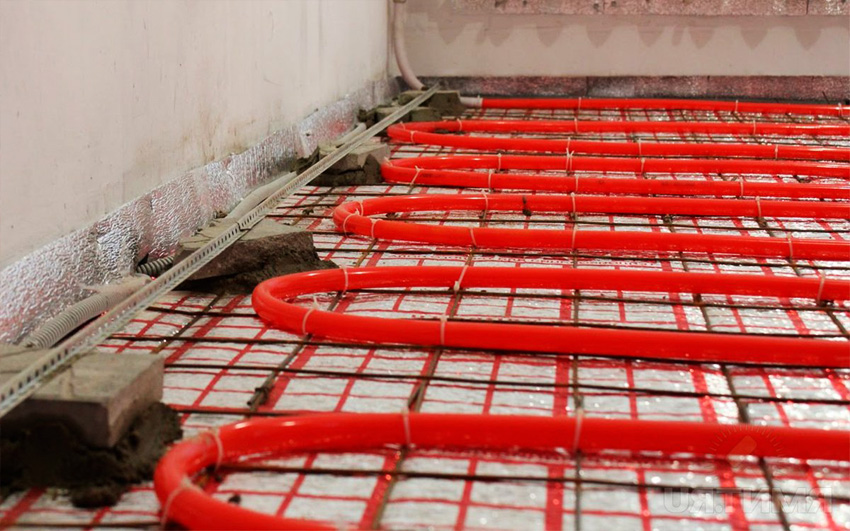 Si le sol en béton doit être coulé, la structure du pipeline est posée directement dans la chape. Avant de mettre en signet, il est recommandé de vérifier l'opérabilité de la communication en recherchant les fuites.