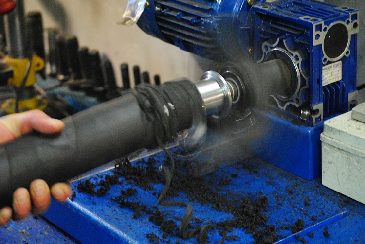Ensuite, il est nécessaire d'enlever la couche externe, qui est constituée de caoutchouc, du tuyau. L'enlèvement de la couche de caoutchouc est effectué avant le tressage au moyen d'une machine spéciale, appelée écorçage. Tous les types de tuyaux ne nécessitent pas de dénudage en caoutchouc (par exemple, pour les tuyaux 2SN).