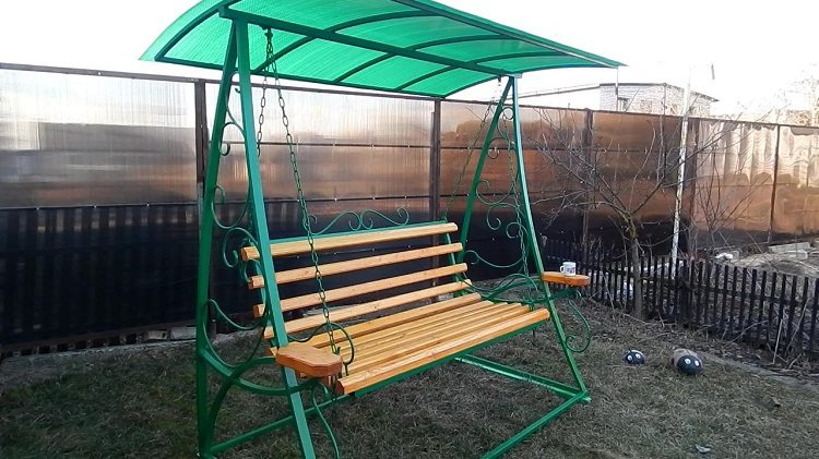 La construction de la verrière serait préférable si la balançoire est installée dans une zone ouverte. Son design peut être varié: droit et en pente, rond, "maison". Le cadre conçu est soudé à partir d'un tube à profil mince et attaché au sommet de la balançoire, puis recouvert d'un matériau en plastique ou en tissu. Vous pouvez le rendre amovible. La décoration du bâtiment sera des produits forgés soudés à la charpente, des éléments d'éclairage décoratifs, des plantes grimpantes, etc. Une fois le travail terminé, la balançoire est testée pour la stabilité et la fiabilité de la fixation.