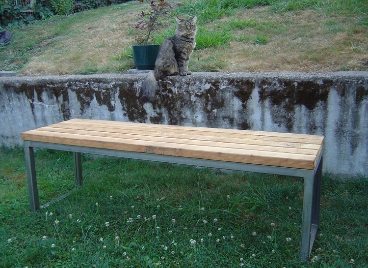 Pour donner aux magasins une esthétique entièrement métallique, les lattes en fer peuvent être placées dans un cadre fait du même matériau. Elle cachera les extrémités pointues. Il ne faudra que 1,20 mètre de tuyau. Un tel banc peut être placé indépendamment - dans le jardin ou dans le parc, mais sous la pluie, il est recommandé de le placer sous un auvent ou de le couvrir de papier d'aluminium.