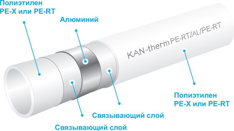 Tous les types de tuyaux métal-plastique se composent de cinq couches: l'intérieur et l'extérieur sont en polymère, l'intermédiaire - en aluminium. Entre le polymère et l'aluminium se trouve une couche adhésive. La couche extérieure de plastique protège le tuyau contre les dommages de nature mécanique ou chimique, réduit l'intensité de la condensation due à une diminution de la conductivité thermique du produit.