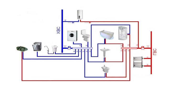 La distribution d'eau, à l'intérieur de la maison privée et à la campagne, est effectuée avec approximativement les mêmes caractéristiques que dans l'appartement. Si la salle de bain et la cuisine sont proches, cela vaut la peine d'utiliser un câblage série. S'il y a plusieurs salles de bains et salles de bains, la disposition du câblage du collecteur est préférable.