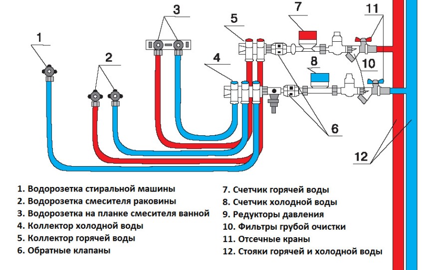 - Depuis le collecteur d'eau froide, ils sont acheminés vers tous les consommateurs: réservoir de chauffage, cuvette des toilettes, baignoire, lavabo, douche, lavabo, lave-linge, lave-vaisselle, etc.