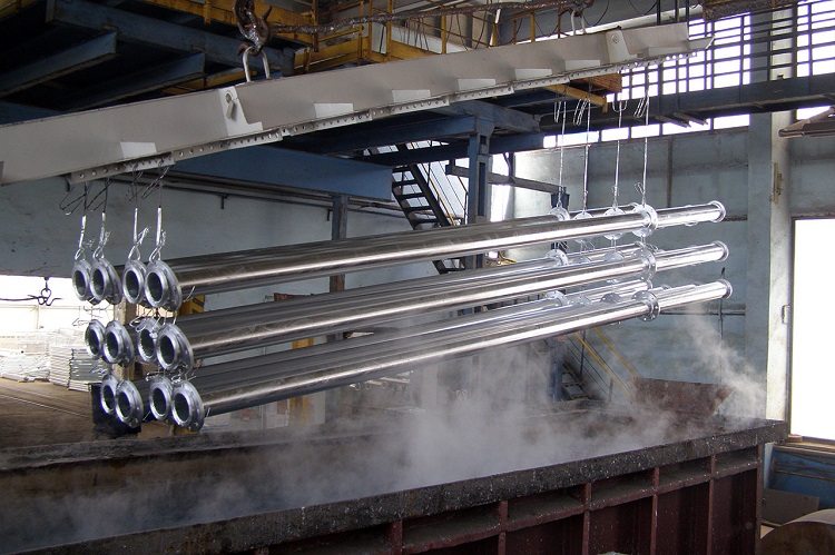 Pour la galvanisation à chaud, les tuyaux sont immergés dans une solution de zinc chauffée à une température de 450 degrés