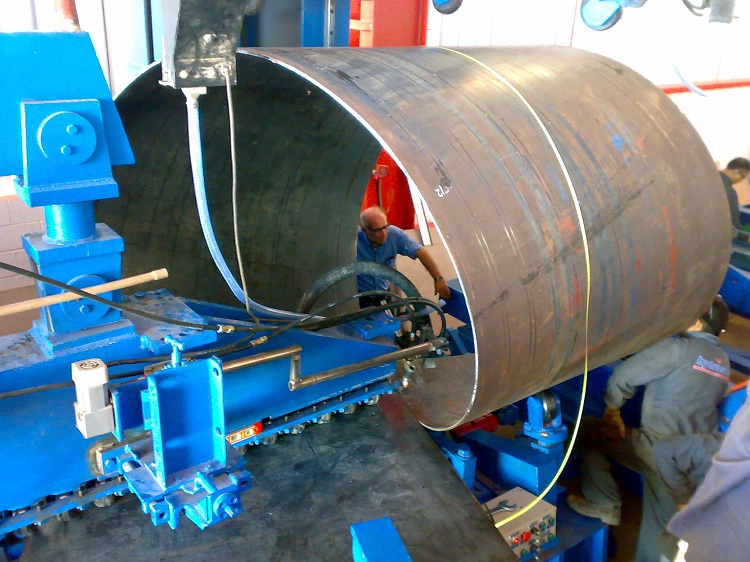 Pour la fabrication de tubes de grand diamètre roulant sur des tôles d'acier alimentées par une grue à la ligne de convoyage, des bandes technologiques sont soudées pour assurer un chauffage progressif de la machine de soudage. La séquence de traitement est la suivante: