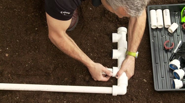 Le système est posé entre les arbres dans les pelouses à une profondeur de 25-30 cm.Les zones passant sous les lits pour éviter les dommages pendant le creusement doivent être approfondies de 40 à 45 centimètres et plus encore. Pour éviter que les tuyaux ne se cassent pendant le froid hivernal, à l'automne, lorsque la saison d'arrosage est terminée, l'eau doit être évacuée du système. Si la pente n'a pas été créée, cela peut être fait en purgeant avec un compresseur.